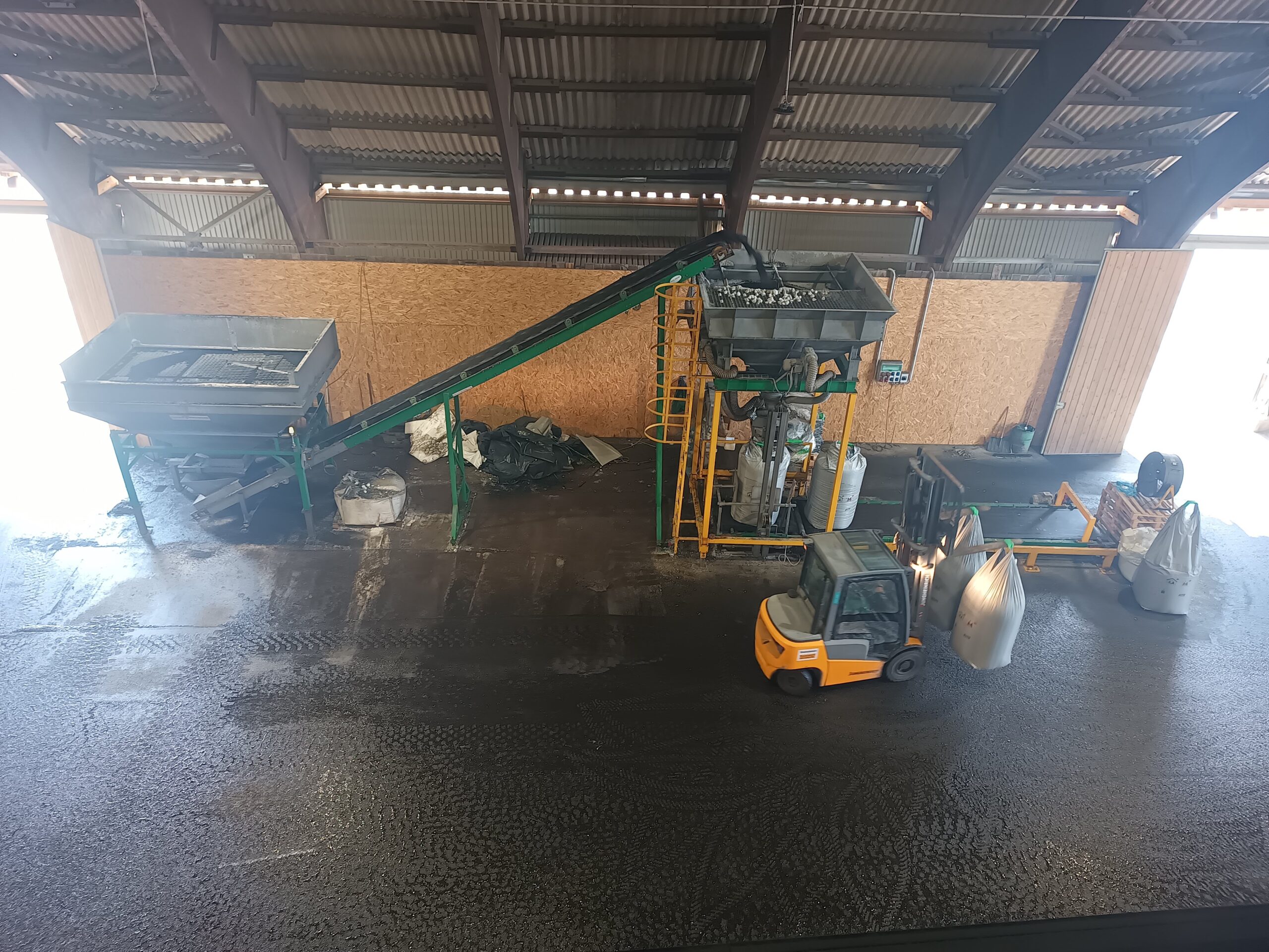 Elhordás & puffer: a megtöltött zsákok az elhordó szalagról a tároló pályára kerülnek; telítődésnél a tárgyreflexiós érzékelő leállítja a töltést.