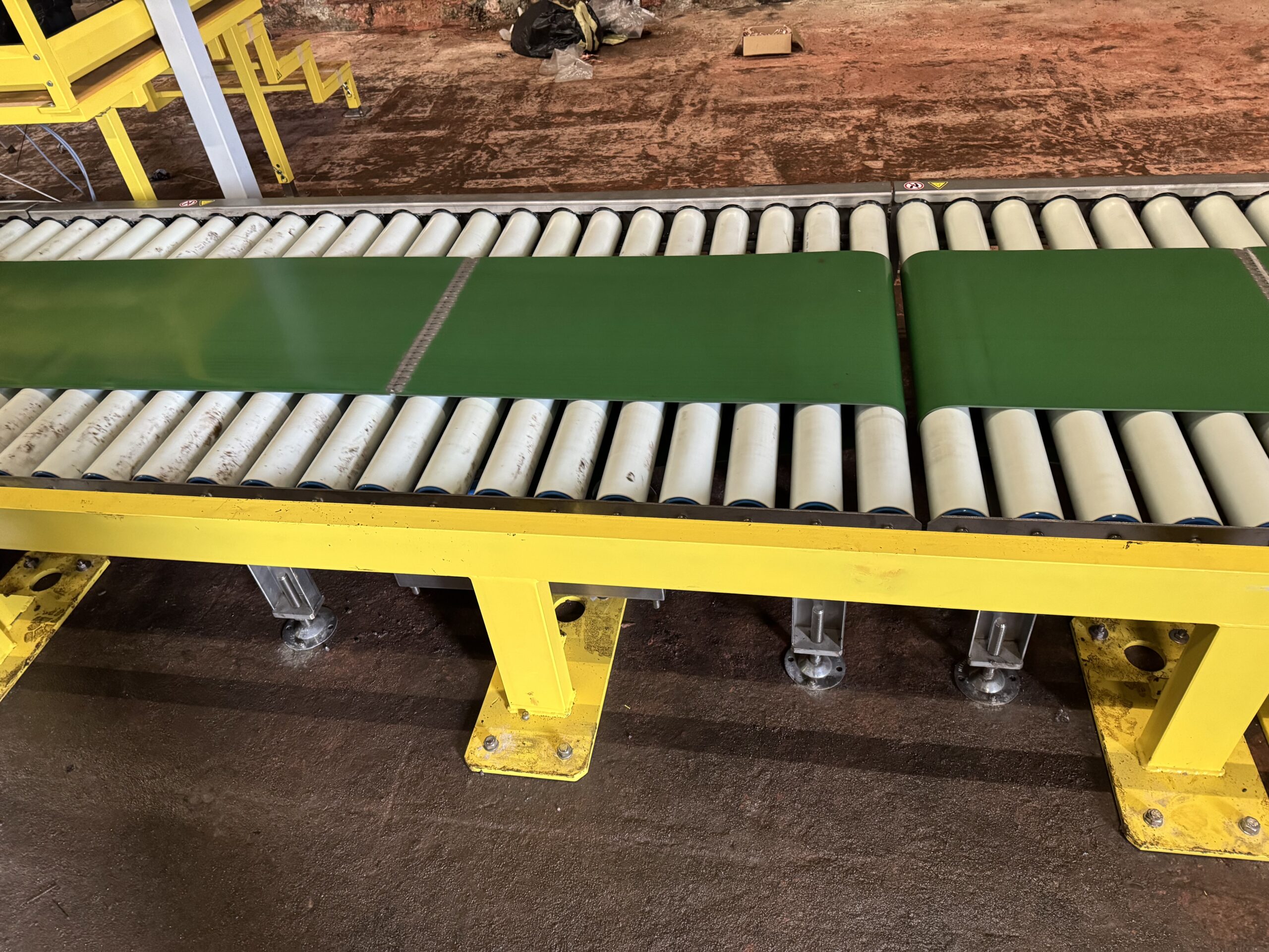Zsáktovábbító–tároló szalag (L≈2610 mm; W=1223 mm; heveder 600 mm; 2,2 kW; duplex lánchajtás; tárgyreflexiós telítődés-érzékelő).