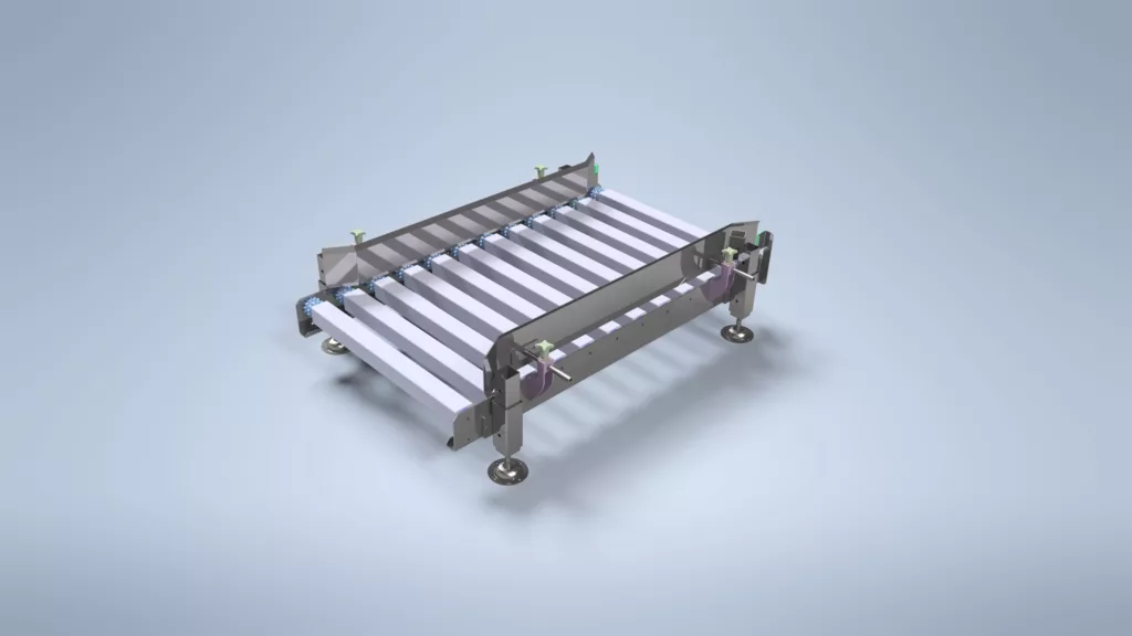A görgős pálya frekvencia váltóval vezérelt aszinkron hajtással rendelkezik, hogy illeszkedjen a fóliázón lévő görgős pálya sebességéhez. Raklap, illetve rakat érzékelő szenzorokkal ellátott pálya.
